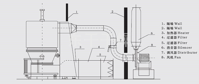 空氣經(jīng)加熱凈化后,由引風機從下部導入,穿過料斗的孔網(wǎng)板。在工作室內(nèi),經(jīng)攪拌和負壓作用形成流態(tài)化,水份快速蒸發(fā)后隨著排氣帶走,物料快速干燥。